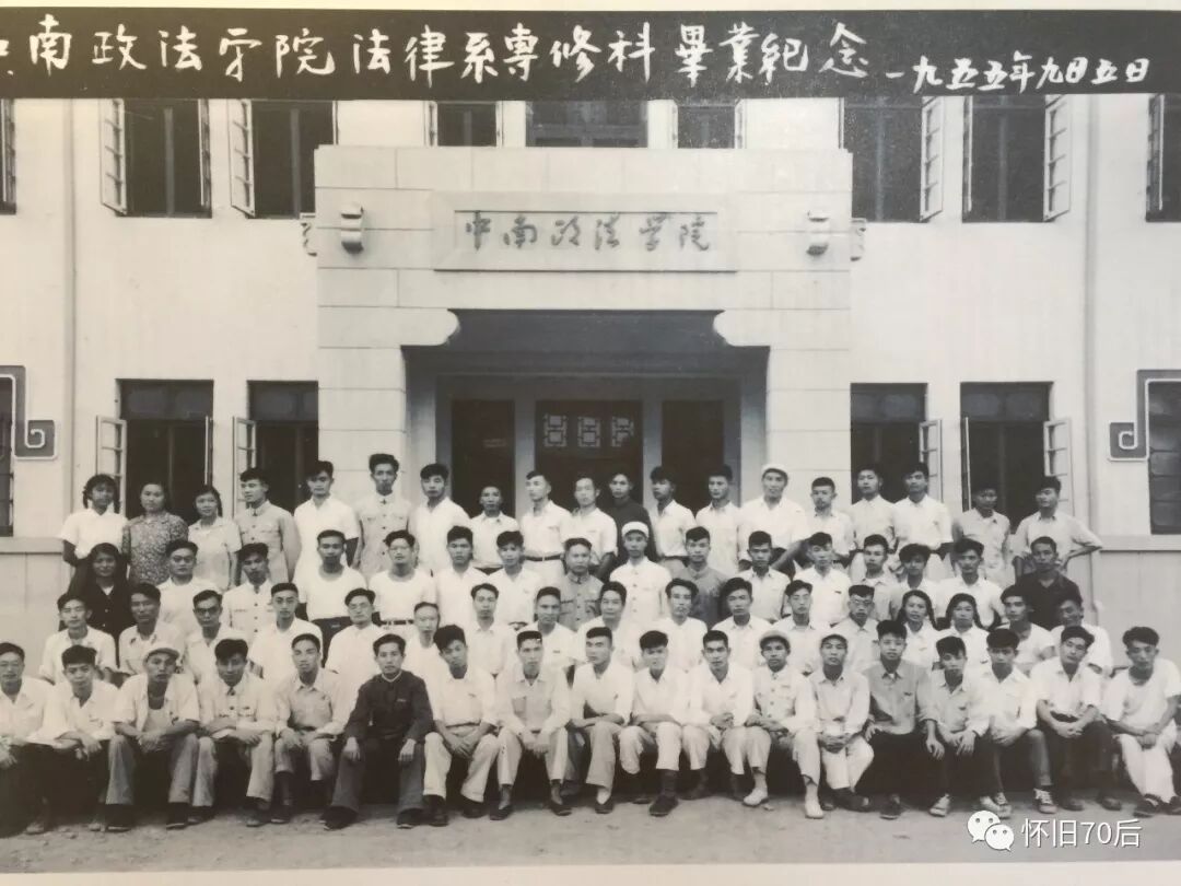 2.法律系专修科。这是1955年9月,法律系专修科毕业的校友。“专修科”是延续民国法律教育的提法,它属于大学或院系的组成部分,修业期限通常为2年。当年的中南政法学院并不大,背后那栋小楼,几乎已是法律系的全部。