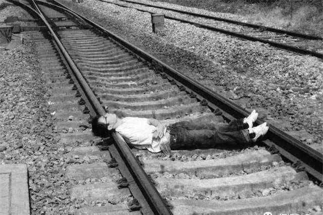 从这个角度看,我觉得最具创意的,还是隔壁宿舍杨同学的“卧轨”照。他们专门跑到学校后面的铁轨上,冒着火车随时开过的危险,拍下了一系列“尸横铁轨”的照片。冲洗出来,同学们无不拍案叫绝:那延伸的铁轨和卧倒的人,足以让你倒抽一口冷气,那就是一种满满一种“犯罪现场”的感觉啊!