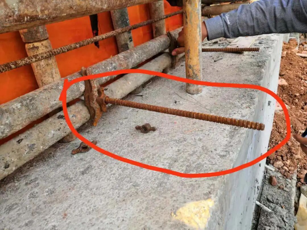 用来固定模板的螺杆两头露出来太长,这样的螺杆你去看他山型扣后面的卡扣,肯定是没有拧紧的,为什么?因为你露出来这么长,要拧很久才能拧到头,一般人都没有这个耐心,头尾两端以5-10公分为宜,会拧得比较紧。