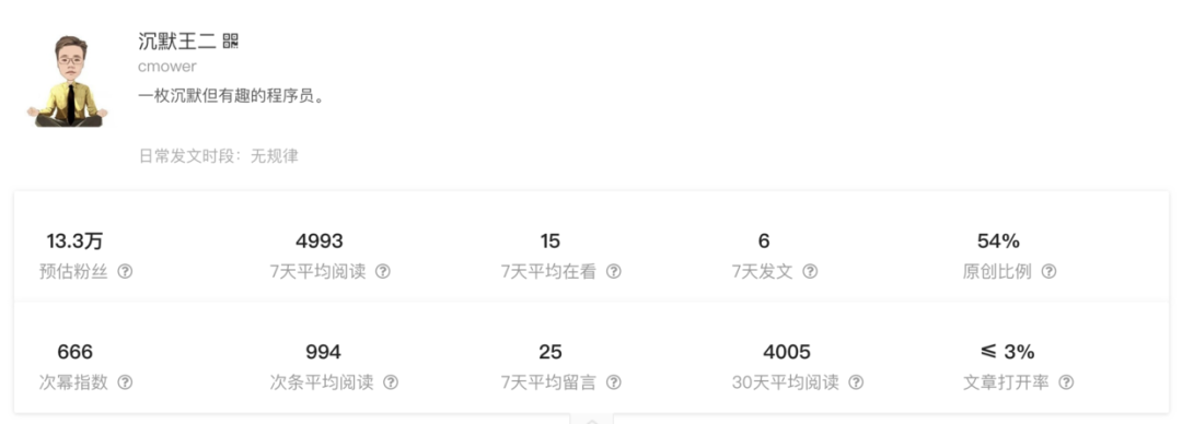 虽然我只有 5 万+ 的读者,但刘志军老师的二十次幂预估我的读者有 13.3 万,我想,这不只是对我文章的一种肯定,更是对读者的一种肯定,你们选的没错,我的公众号已经远超平均值了。