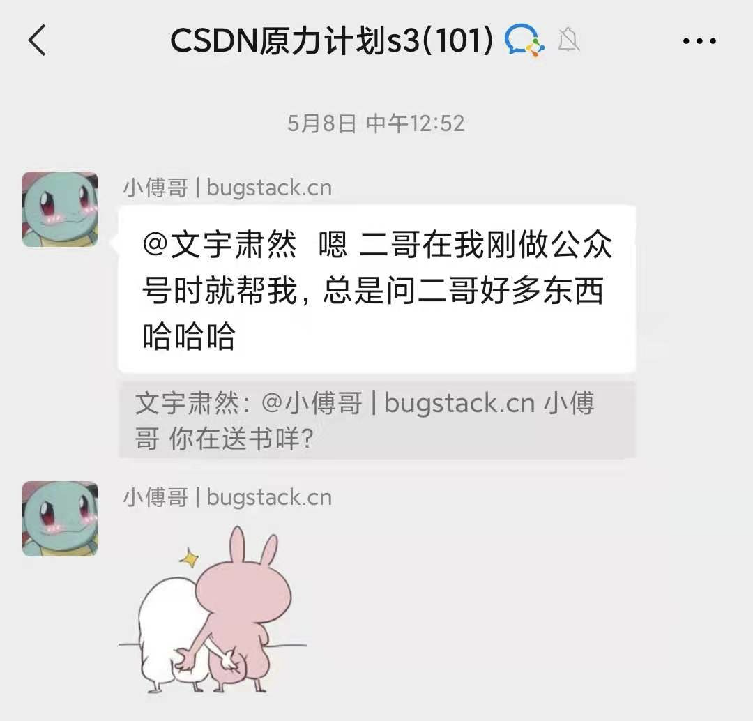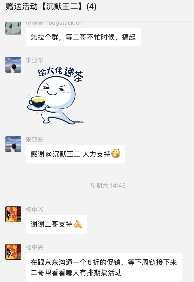 杨老师和宋老师也非常配合,扬言一定要满足二哥的诉求,直接在群里下了狠话:“书需要几本合适二哥说的算!”我没敢多要,朋友圈要了 5 本,公众号要了 10 本,毕竟书这东西,“少为贵”!