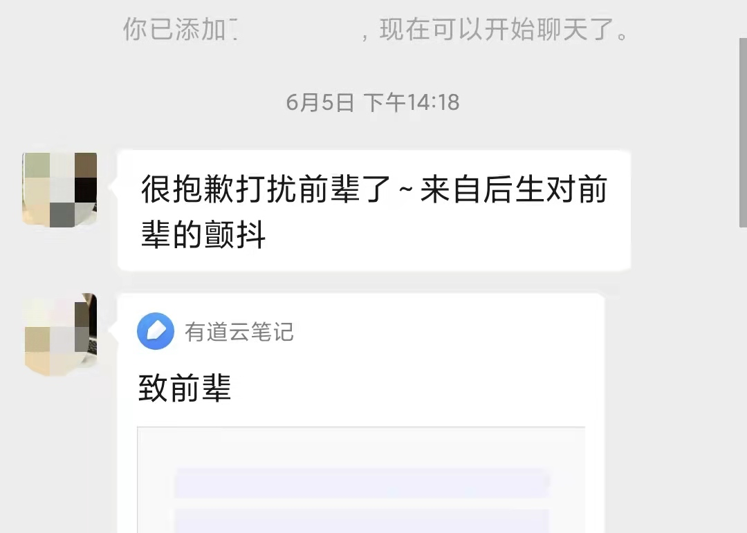 见下图,微信上收到读者发来了一篇有道云笔记《致前辈》。