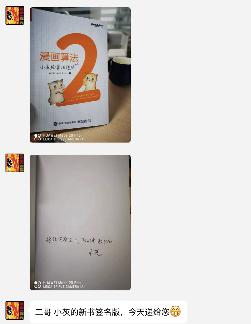 前段时间,电子工业出版社的杨老师给我说,小灰又出了新作——《漫画算法 2》,并且快递给我了一本小灰的亲笔签名书,见下图。