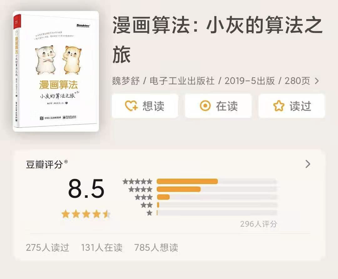 小灰的《漫画算法》算是一本很好的入门书了,在豆瓣有 8.5 的评分,关键是销量,算是技术图书里面的顶流了,第一版卖出去了 7 万多册,真是一个很了不起的成绩啊。
