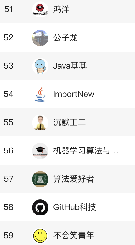 给大家看张图哈,这是二十次幂上开发者领域的公众号上周排名,我能跻身到全国前 60,这个排名的算法考虑到了文章的阅读数、留言数、点赞数等等。