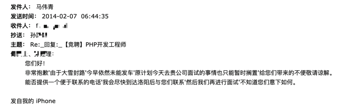 那年下了很大的雪,路封了,所以好几个面试都没赶上,心里着急的一笔,因为洛阳的面试机会少得可怜。下面是回复 HR 的一封邮件。