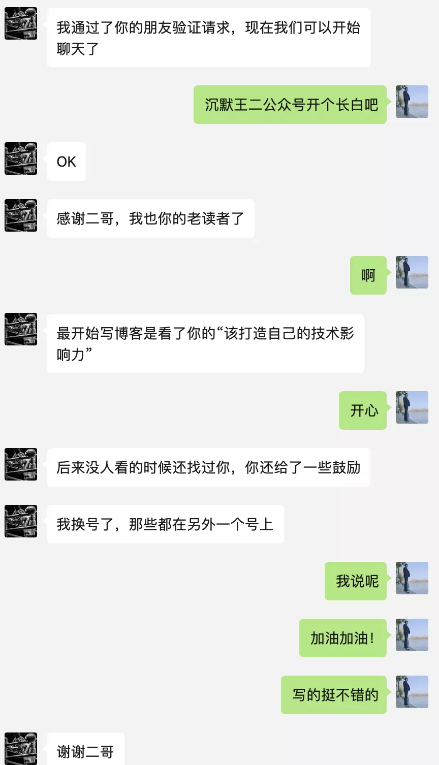 我不是什么技术大牛,也不是高材生,也没有什么天赋,我只是一枚普普通通的程序员。但当我知道,我的文字也能对一个人,对一群人,对很多人产生影响的时候,我内心也会情不自禁的开心、感动~