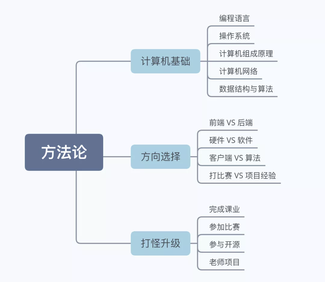 对于你来说,大一和大二已经结束了,不知道你的课程是怎么安排的。关于大学期间的学习规划和路线,我画过这样一副思维导图。