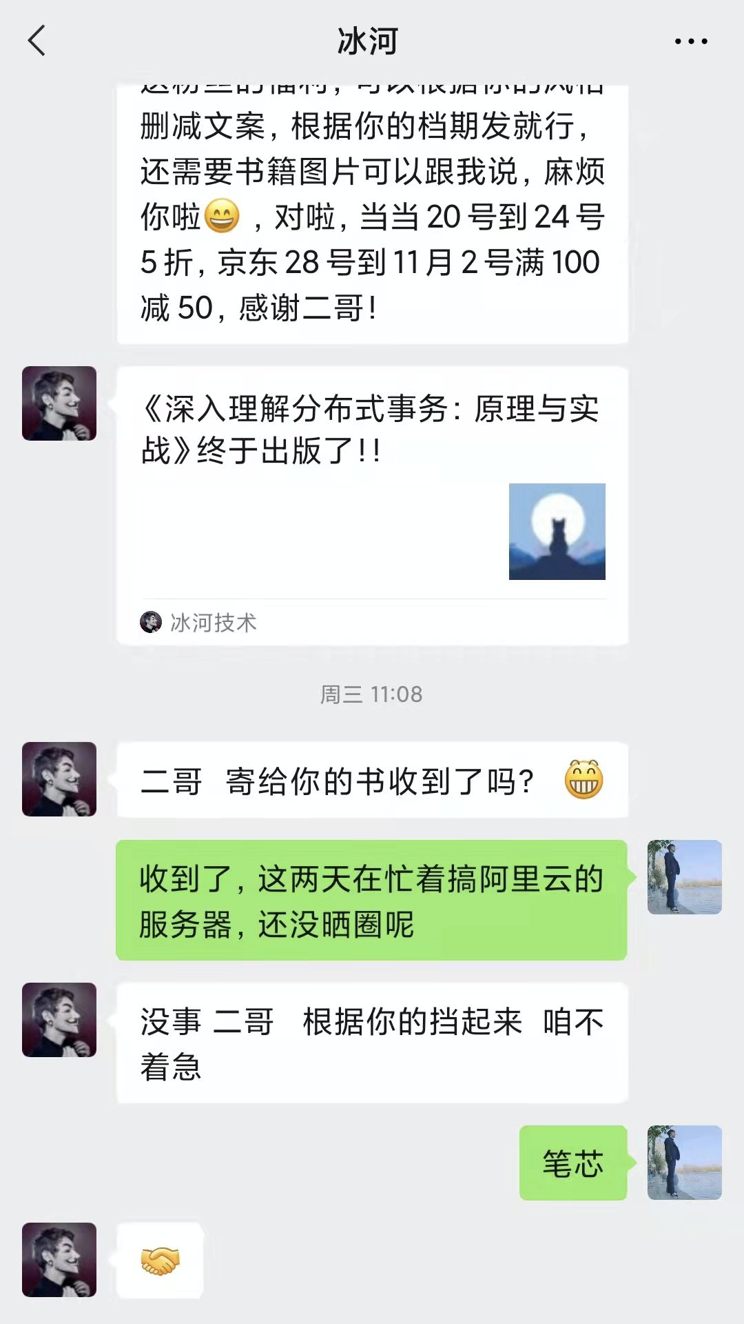 10 月份公众号和朋友圈送出去了不少好书,中奖的读者应该都收到了吧?我看有好多小伙伴都晒全并私信二哥了。这里再预告一下,下周一的朋友圈会再送一波,因为人民邮电出版社的傅老师都等不及了!
