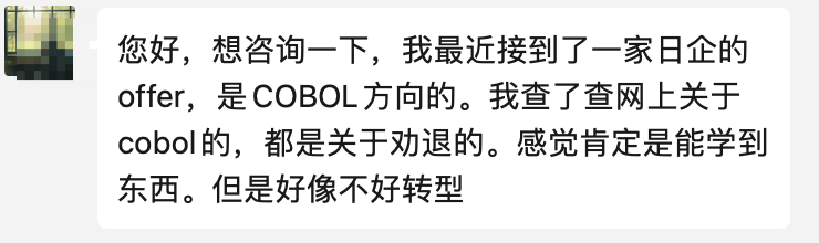 微信上收到一条读者的私信,大致的情况是这样的:他接到了一家日企的 Offer,COBOL 方向的。他去网上查了一下,大部分都是劝退的。他很担心干了几年 COBOL,再转 Java 会因为没有项目经验,而找不到新的工作。。