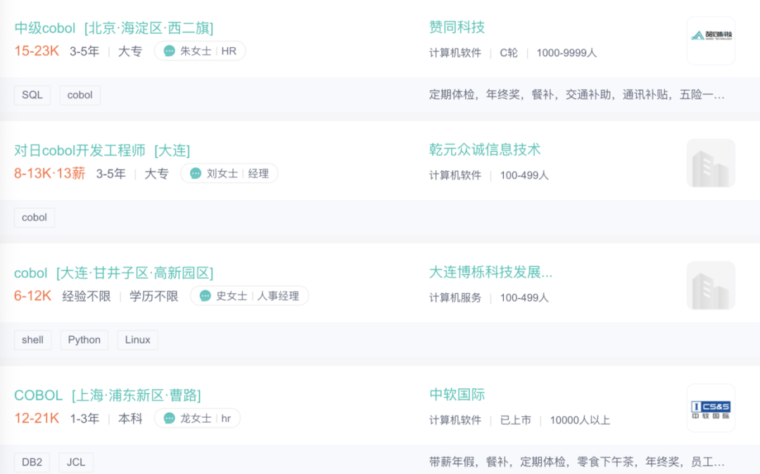 虽然随着时间的推移,COBOL 程序员会越来越少,但就目前来看,确实还是有工作机会的,并且在学历上也不会卡的非常严苛,薪资待遇还算是说得过去。