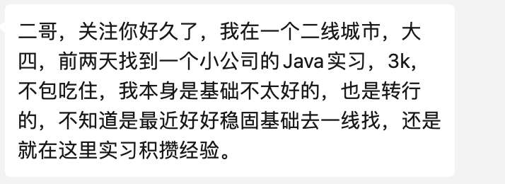 11 月初的时候有个读者问了我这个问题:大四,二线城市找了一个小公司的 Java 实习,3k,基础不太好,并且是转行的,不知道该不该接: