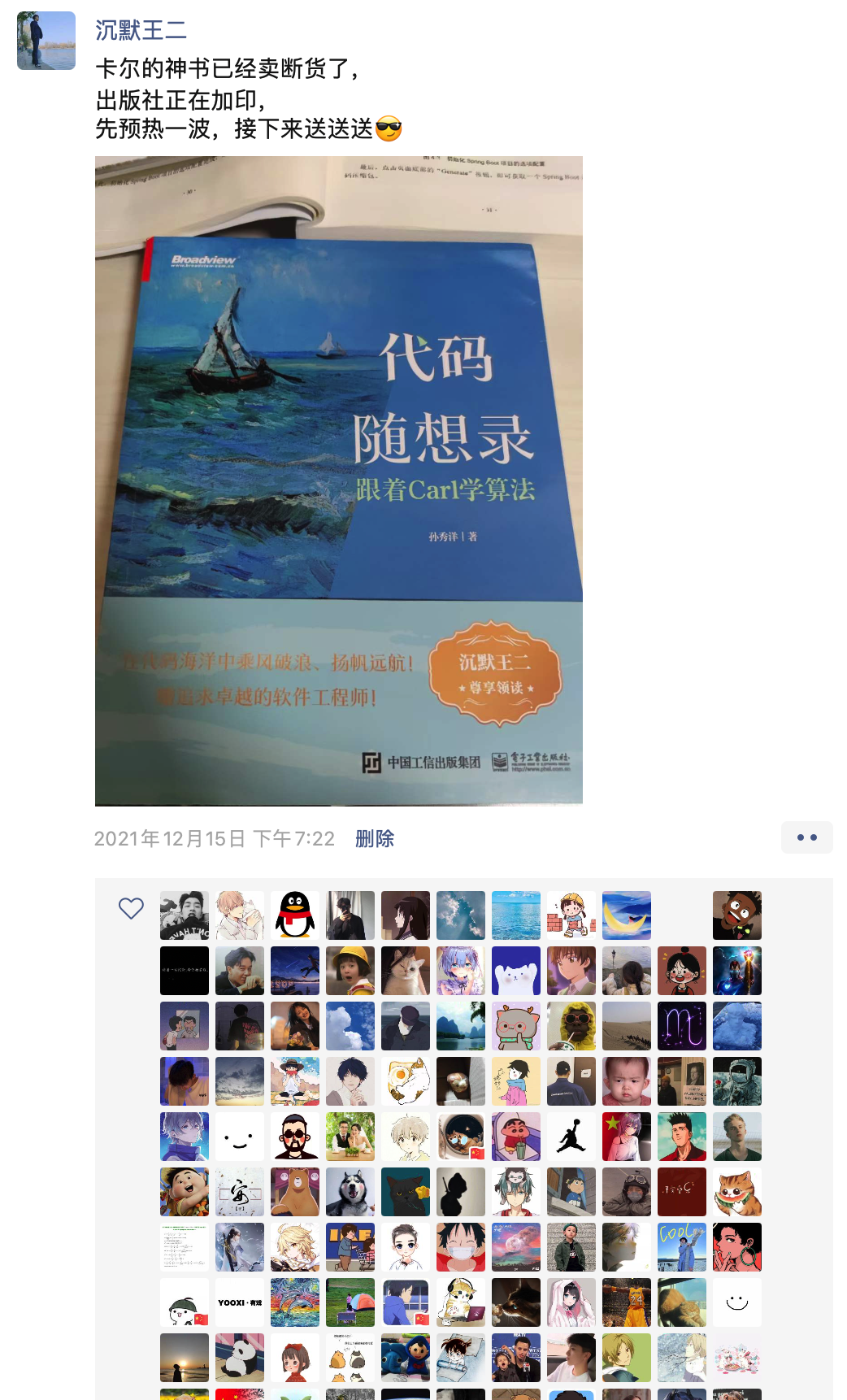 《代码随想录》这本书的原价并不便宜,138 元,但目前杨老师给我透露说,有 5 折的优惠,持续到 12 月 31 号。