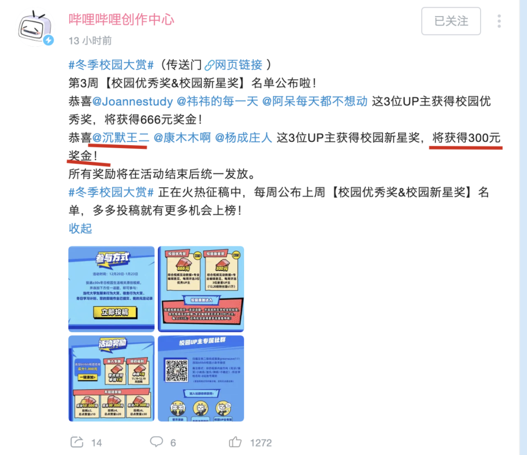 从众多的宫斗剧中我得出了一条宝贵的人生经验:“母凭子贵”。这条经验同样适用于二哥本人,可能会因为这一期视频,吹这辈子最多的牛逼:这不,荣获哔哩哔哩第 3 周【校园优秀奖&校园新星奖】。