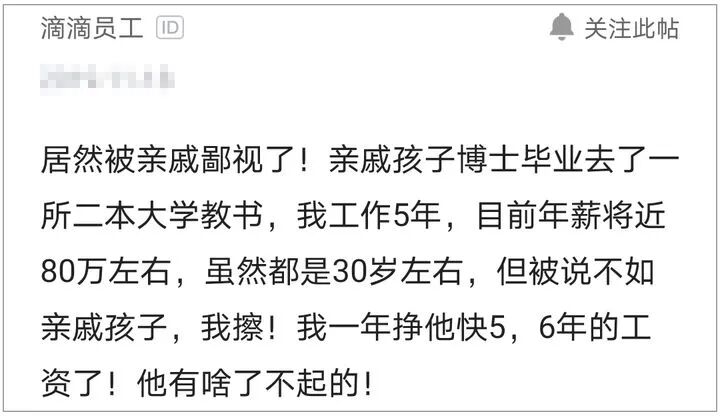 从这个帖子可以看得出来,某滴滴员工虽然被亲戚鄙视了,但心里很不服气,认为自己比亲戚家孩子挣得多,二本教书的没什么了不起。