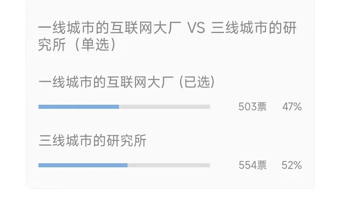 之前在一篇美团还是研究所,美团年包多二十万,怎么选的文章里做过一个投票:一线互联网大厂还是二三线城市的研究所?
