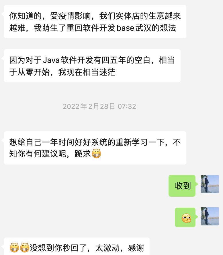 这期间有四五年的空白期,但依然想重回软件开发。换做是我,可能就没有这份勇气,惭愧。