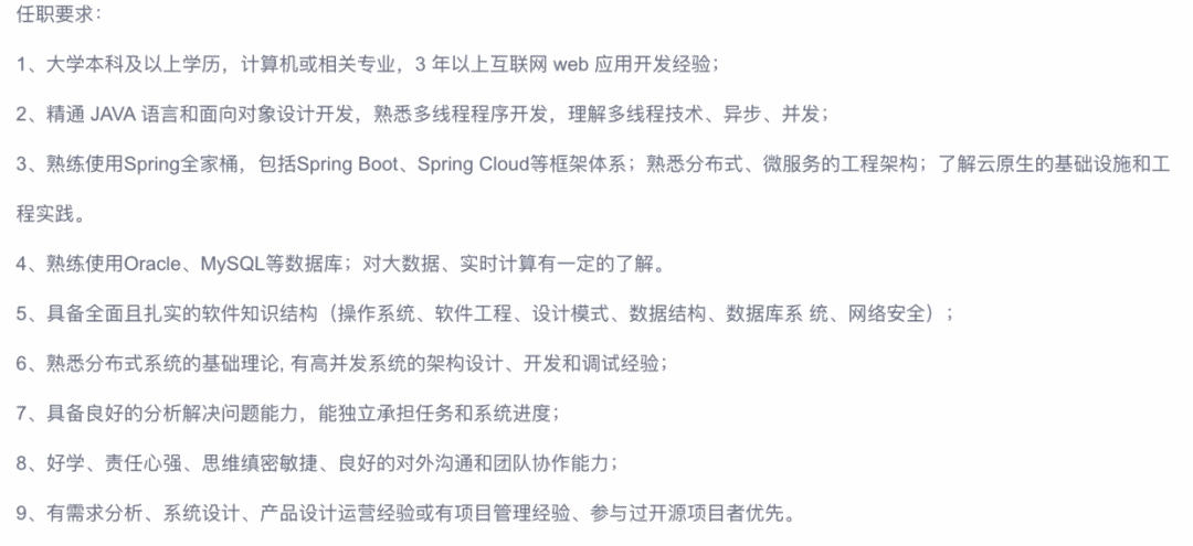 从任职要求上可以看得出,学历是第一位,然后是 Java 基础,其次是 Spring 全家桶,之后是 MySQL,然后是计算机基础知识,最后是综合素质。
