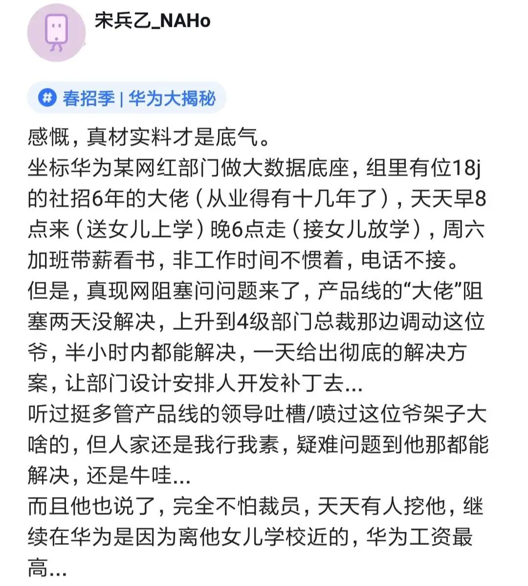 其实我是比较讨厌这种,吃不到葡萄说葡萄酸的人。这不,就有网友出来证实了,说自己在华为真遇到过这样的真大佬。