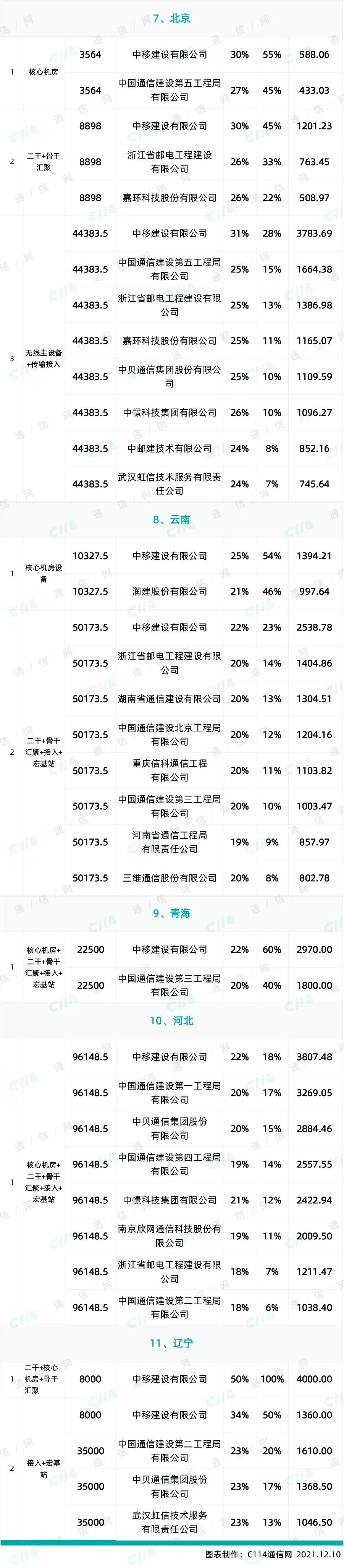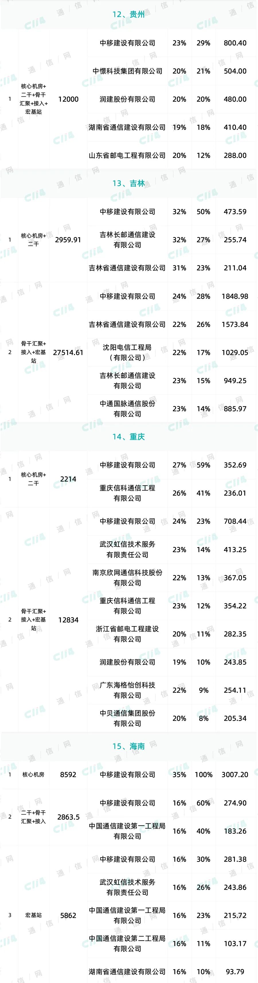 从12个专业公司和15省份的中标情况来看,截止目前,12家专业公司及11个省份的中标企业已有21家,但绝大部分份额被中移建设拿走,无疑中移建设是第一大赢家。目前,中移建设共获得24个专业公司及省份的总计计33个标段的份额,中标金额约约为62947.71万元(不含税);其次为浙江邮电工程,共获得6个专业公司及省份共计7个标段的份额,中标金额约为7377.72万元(不含税);目前排名第三的企业为中通二局,共获得5个专业公司及省份共计6个标段的份额,中标金额约7535.5万元(不含税)。