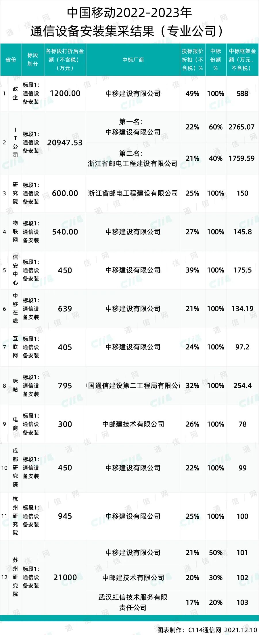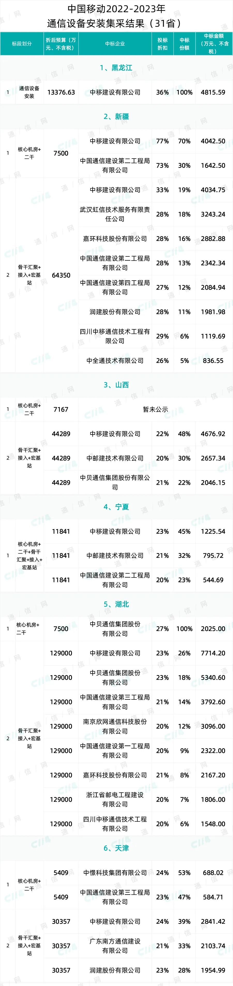 从中国移动官网获悉,备受关注的45个专业公司及省份的“中国移动2022-2023年设备安装通信工程施工服务集中采购项目”已于昨日公示了12家专业公司的中标结果,分别为:政企、IT公司、研究院、物联网、信安中心、中移在线、互联网、咪咕、电商、成都研究院、杭州研究院、苏州研究院、上海研究院;以及15个省份的中标结果,分别为:黑龙江、新疆、山西、宁夏、湖北、天津、北京、云南、青海、河北、辽宁、贵州、吉林、重庆、海南。