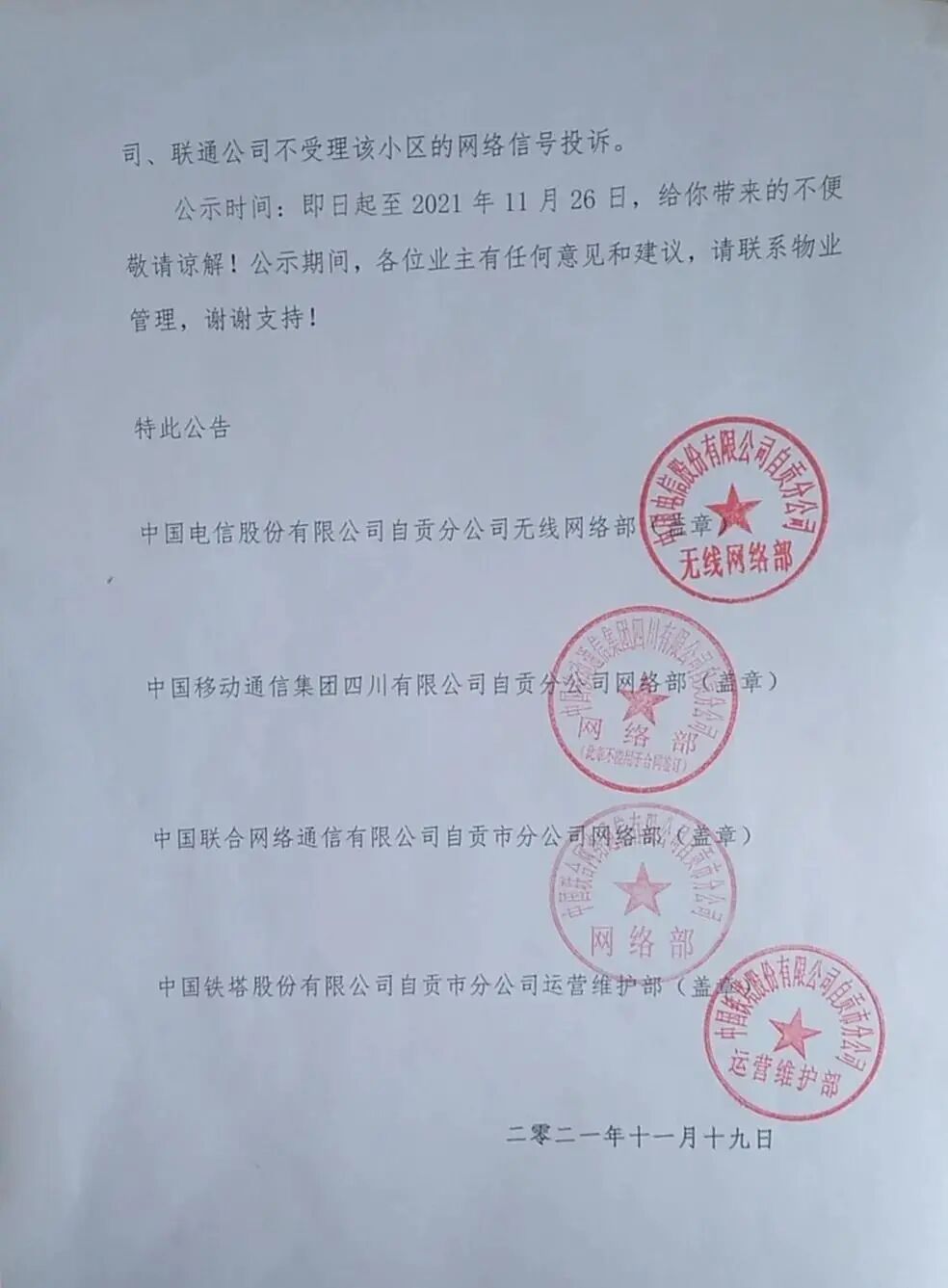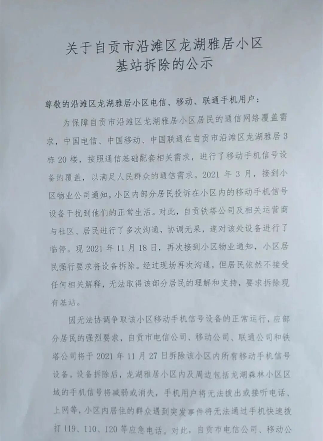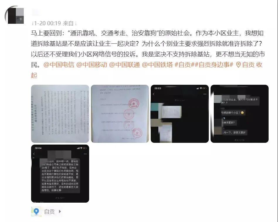 近日,微博某网友爆料:四川自贡一小区因与居民协调无果,将拆除小区内所有移动手机信号设备。