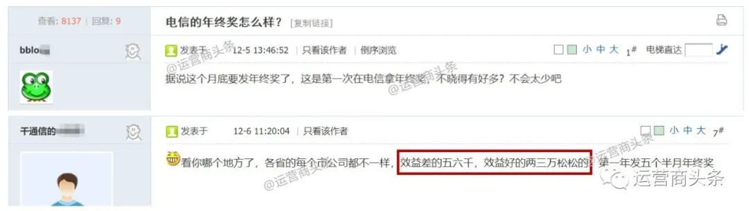 无独有偶,另一家通信运营商中国电信员工也透露了他们的年终奖了:说效益差的地市五六千,效益好的地市两三万轻轻松松。(他是三岗级,本月底到账)。