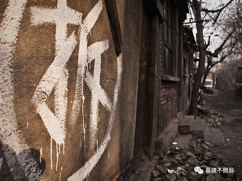 如果改成居民还没搬走的时候,只要墙上写的“拆”,就预示着这一片会发生,大面积的,搬家人员会频繁进出,车辆也会从这儿出入,不确定的隐患也会增加,这个首先就是提醒经过的行人注意安全,也注意,尽量我要贴近这个区域来行走或者是能够快速通过写有“拆”字区域的地方。