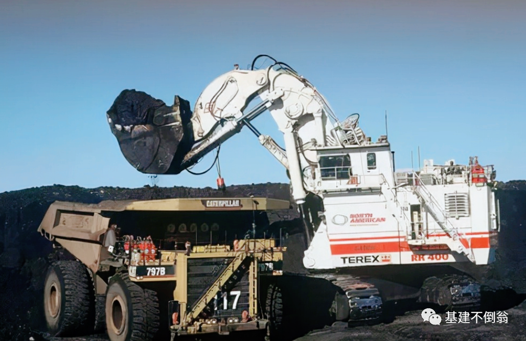 比塞洛斯RH400一个挖掘铲就有84吨的重量,它的臂推力达到了3300千牛,才能挥舞动这么重的挖铲,一次作业吊臂挖下一铲子,有45立方米的物料,大约是一铲子能挖起一个房间。