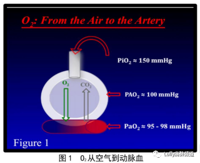 氧气如何从空气转运至动脉血:肺泡空气方程。我们吸入的空气中氧气约占21%。海平面的大气压为760mmHg;一旦空气进入气道,即被水蒸汽(47mmHg)饱和。吸入空气时的氧分压(PiO2)的计算如下: