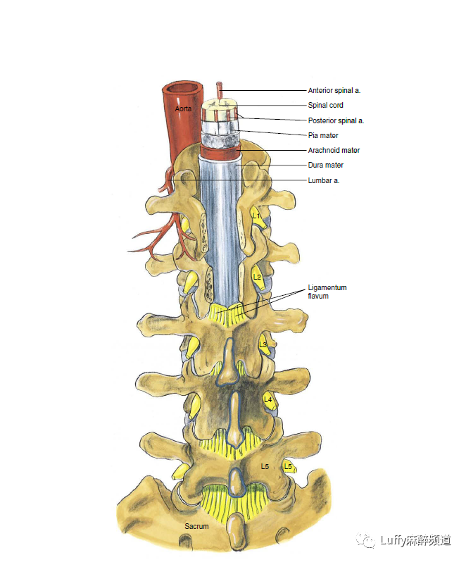 Anterior spinal a脊椎前动脉、Spinal cord脊髓、Posterior spinal a脊椎后段、Pia mater软脑膜、Arachnoid mater蛛网膜、Dura mater硬脑膜、Lumbar a腰椎动脉、Ligamentum flavum黄韧带、Sacrum骶骨