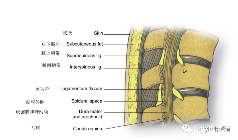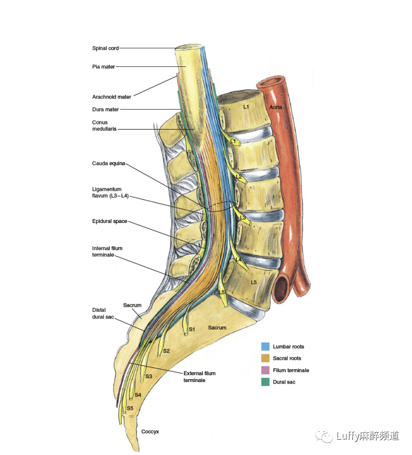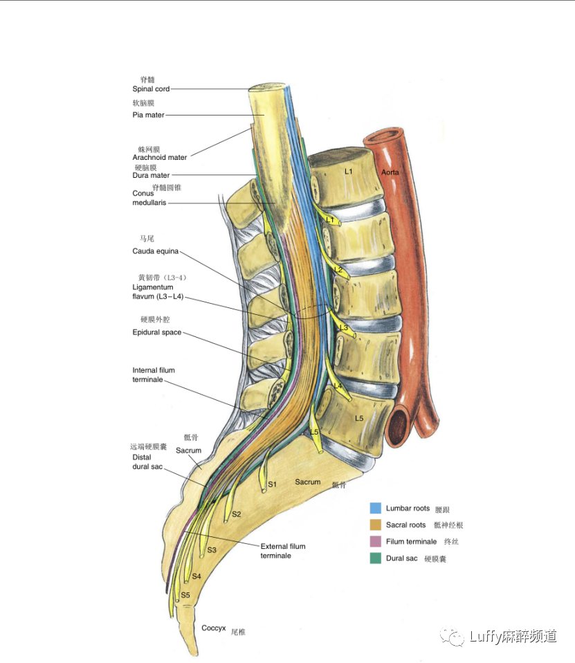 Spinal cord脊髓、Pia mater软脑膜、Arachnoid mater蛛网膜、Dura mater硬脑膜、Conus medullaris脊髓圆锥、Cauda equina马尾神经、Ligamentum flavum (L3 – L4)黄韧带(L3-L4)Epidural space硬膜外腔、Internal filum terminale内终丝、Sacrum骶骨、Distal dural sac远端硬膜囊、External filum terminale外终丝