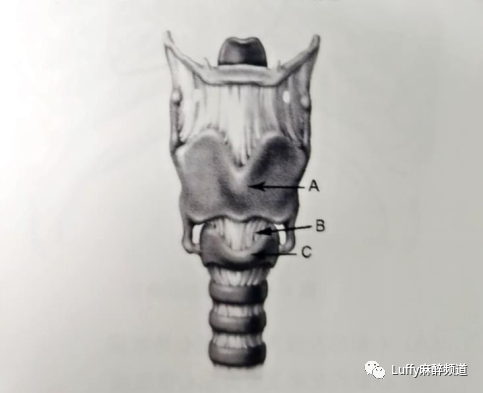 解析:在喉的浅表面,喉的甲状软骨(A)和环状软骨(C)由环甲膜(B)相连。这层膜一般2-3cm宽,1cm高。声带的前附着点在环甲膜上界上方大约1cm的位置。因此,通过这层膜进入气道(如环甲膜切开)可以保证操作者远离这些关键结构。唯一需要注意的是,甲状腺上动脉的分支环甲动脉一般穿过环甲膜的上外侧。因此,尽量在环甲膜的下侧做切口并限制切口的宽度是明智的选择(虽然在抢救患者的紧要关头,做环甲膜切开时,小血管的损伤并不会是你的关注重点)。大约有40%的人的甲状腺锥状叶沿着中线向上延伸,所以在环甲膜切开时可能会被损伤。