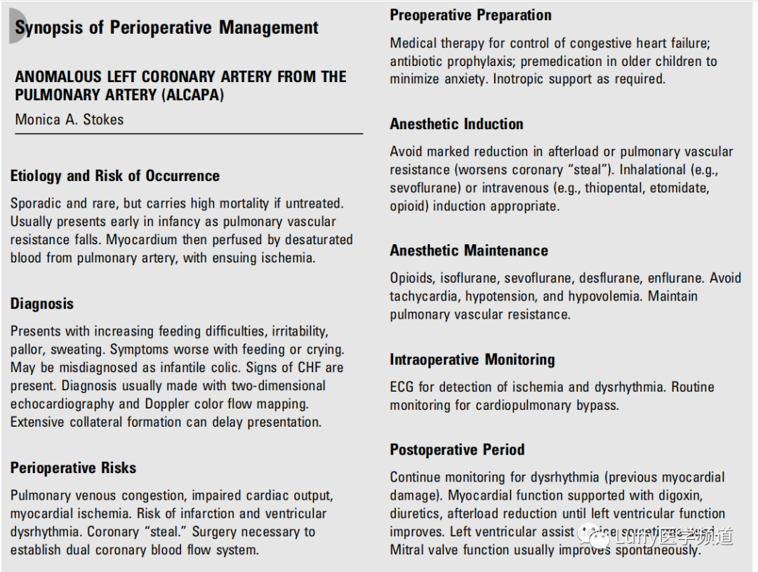有症状的婴儿有肺静脉充血、临界点心输出量、因缺血或梗死引起的心肌收缩力下降,以及中增加了发展为室性心律失常的可能性。靠医疗管理的支持,直到手术血运重建进行。麻醉管理的目标是维持全身血氧饱和度,并防止心肌需氧量的异常增加,如心动过速。必须避免鼓励冠状动脉“偷窃”的因素,如由于过度通气导致的肺血管阻力降低,低PaCO2或高fio2。具体来说,其目的是轻微降低心率,正常或轻微增加肺血管阻力,并优化心输出量。围手术期通常需要肌力性给药,尽管改善心肌收缩力的好处必须与潜在的心肌耗氧量增加和心律失常风险进行权衡。使用左心室辅助装置的机械心肌支持在具有相关专业知识的中心可能是一种更好的方法。