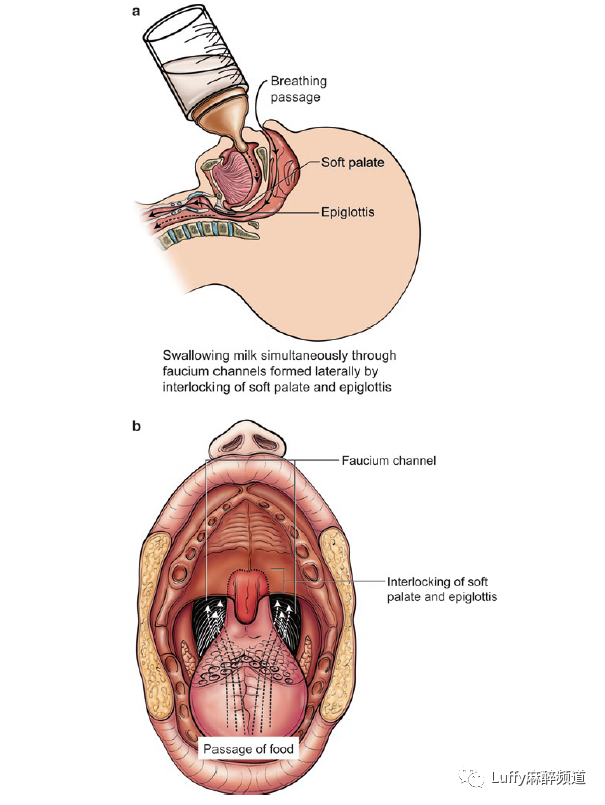 婴幼儿的喉部抬高可以同时呼吸和吞咽。(A)会厌和软腭在功能上相互交错,(B)形成侧方穹窿通道以允许乳汁通过。