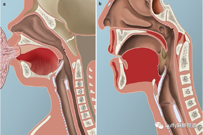 婴儿和成人喉的矢状切面:(a)婴儿喉位于C3-C4水平的颈部高处。(b)由于在物种的系统进化过程中获得了发音,成年人的喉位于C6-C7水平