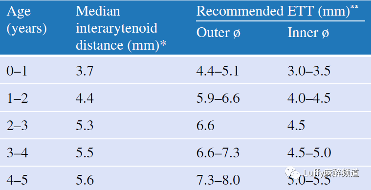 声门下管腔直径与推荐气管内管(ETT)大小的比较