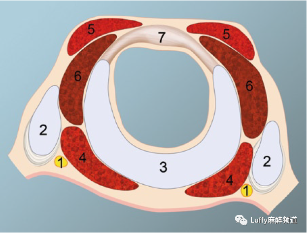RLN与环甲关节的关系:环甲膜水平切面(图):(1)RLN,(2)环甲关节,(3)环甲板,(4)环鳃后肌,(5)环甲肌,(6)环枢外侧肌,(7)环甲膜。喉返神经位于环甲关节的正后方。