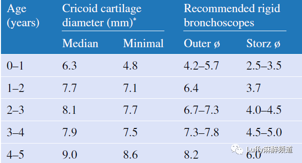 声门下腔直径和推荐的内镜管尺寸