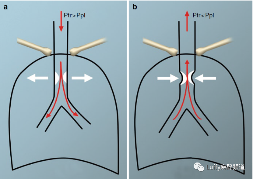 (A) 吸气时,气管内压(PTR)高于胸膜压(PPL)。这将根据梗阻的严重程度维持几乎正常的吸气流速。