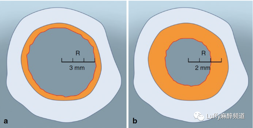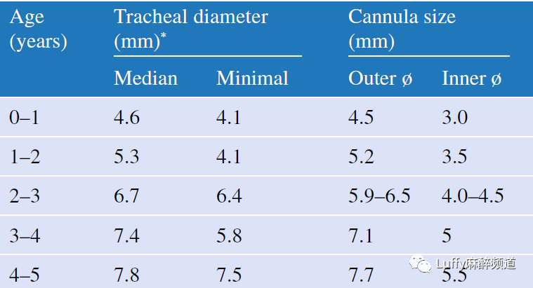 根据Holinger的说法,后声门的宽度(即杓骨间距离)大约相当于声门下腔的80%。如果以声门下腔中值直径的80%计算杓间距离的中位数,那么所有推荐的ETT都是过大的,在不对粘膜施加过大压力的情况下不能适合后声门(表如下图)。为了避免插管引起的医源性并发症,麻醉医师和强化医师必须意识到ETT和儿科气道大小之间的差异。应遵守以下原则: