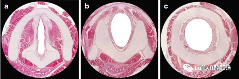 婴儿喉部的水平组织切片。。(A)甲状软骨呈圆形,不像成人那样呈V形;颧骨较长,占声门长度的一半;环状软骨略呈V形(声门水平部分)。(B)由于上环状软骨呈V形,声门下腔呈椭圆形(环状软骨中部的截面)。(C)在环状软骨的下部,管腔呈圆形。