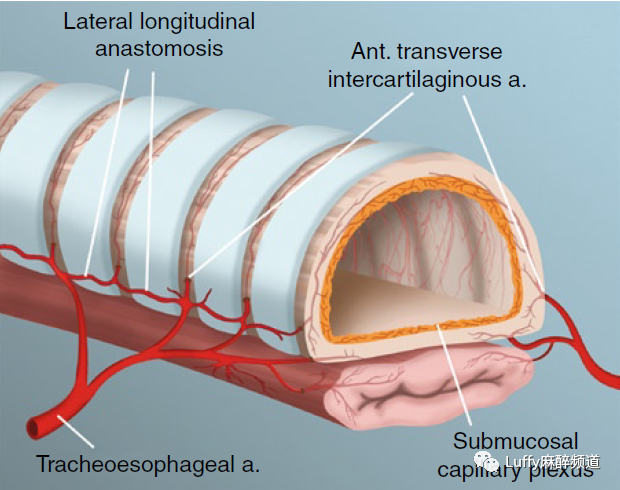 气管显微血供示意图:气管粘膜下丰富的血管网起源于横向纵向吻合的软骨间横动脉。(改编自Salassa。版权所有梅奥医学教育和研究基金会)