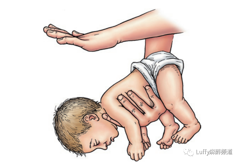 对于婴儿,由于其相对较大的肝脏可能受到损伤,建议使用背部击打和胸部推力来缓解完全的气道阻塞。婴儿俯卧着,头朝下,放在救援人员的手臂上(下图),手臂反过来又靠在救援人员的大腿上。发出五个反击(巴掌)。然后,婴儿仰卧,头朝下,然后进行五次胸部推力。口咽应该根据这些动作进行肉眼检查,看看是否有异物可见。当治疗1岁以上的儿童时,会进行一系列的海姆立克急救手法,无论是直立姿势还是仰卧姿势。口咽部应在两次检查之间进行检查。任何时候都不推荐盲扫手指。如果在院前设置的两次特定年龄的操作后,气道阻塞仍然存在,应该检查气道,如果发现异物,应该努力用麦吉尔钳取出异物。进行这些操作,直到异物被取出或病人变得没有反应。如果患者反应迟钝,在开始呼吸前,应仔细观察口腔内的情况,开始心肺复苏术。如果异物在气道内,但够不到,插管可以将异物移入一个或另一个主干支气管,从而解除完全阻塞。如果所有这些策略都失败了,
