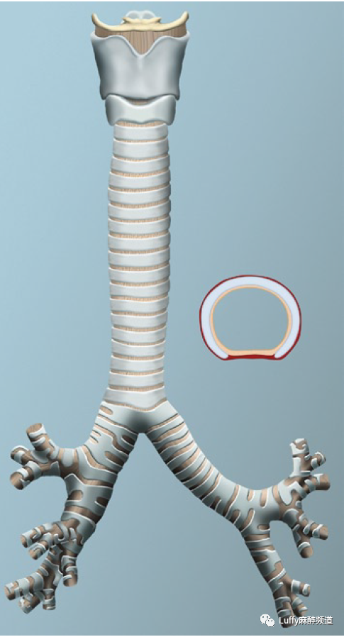 婴儿气管:一般结构与成人相似,有16-20个马蹄形气管环和一个膜部。它的长度只有成人的50%,直径36%,横截面积15%