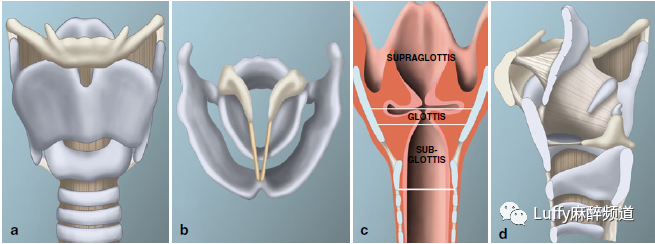 3.在成年人中,这一比例下降到20%,颧骨间距在新生儿约占声门下内径的60%,在成人约占该直径的70%以上,在新生儿约占声门下内径的60%,在成人约占该直径的70%以上。4.婴儿楔状软骨比成人大;楔状软骨与杓状软骨没有直接联系。婴儿环状软骨的头侧半部呈V形,·在其下方变为圆形(图2.5b和c)。婴儿喉部的软骨比成人的更柔软、更柔韧。