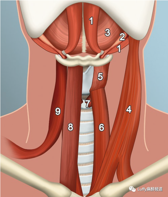 颈部喉的前部肌肉悬吊:一条带状肌肉,甲状腺舌骨,将喉悬吊在舌骨上,而舌骨上的肌肉间接将喉悬吊在下颌骨上。请注意甲状腺软骨在颈部的高位置以及随后的颈部长气管段。喉外肌:(1)二腹肌,(2)茎突肌,(3)下颌舌骨肌,(4)胸锁乳突肌,(5)甲状舌骨肌,(6)胸骨甲骨肌,(7)环甲肌,(8)胸骨舌骨肌,(9)舌骨肌