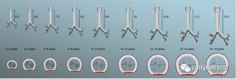 气管的长度和直径:从出生到青春期,气管的长度增加了一倍,直径增加了三倍,横截面积增加了六倍。