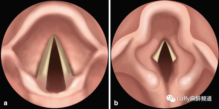 1.在吸气过程中,软骨声门与韧带声门的比例增加,突出了声门的五角形。直接声门下腔是椭圆形的,这是由于环状软骨的V形上半部分。