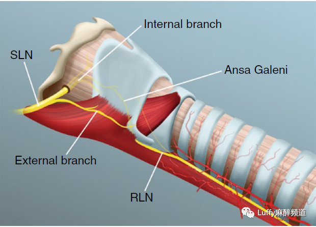 喉的神经支配:SLN(喉上神经Superior laryngeal nerve):内分支为声门上和声门提供感觉功能-外分支为环甲肌提供运动功能∙
